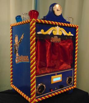 Programmed carnival lights on top of the clock and the programmed billboard lights inside act differently depending on the hour (Rudy's mood). Red button in back sets the time.