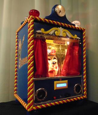 Attract Mode - Red button in front turns on/off attract mode. Curtains open and Rudy looks around for a few seconds if someone is near the clock (randomly). The illuminated white "eye" in front of the clock denotes if attract mode is on.