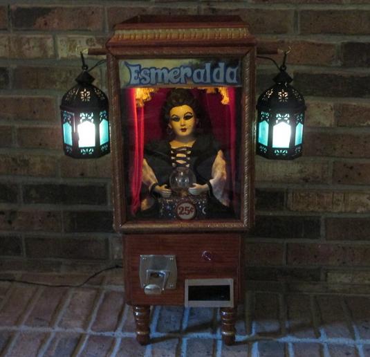 It shares a similar antique oak cabinet design as the first machine "Esmeralda" (see below), and is fully operational, including operating on a coin and vending a fortune ticket at the end of the program .